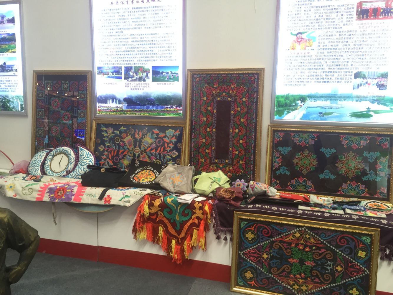 我中心应第八师石河子市政府邀请参加该博览会,展览的产品主要为必赢官网承担文化部、教育部组织的中国非物质文化遗产传承人群研修研习培训哈萨克毡绣布绣项目的学员作品,共有60件左右,展品全部位于第八师石河子市展区。展品类型主要有日常家居用品、文化旅游纪念品、区域文化礼品、车载文创产品四类。