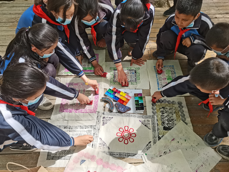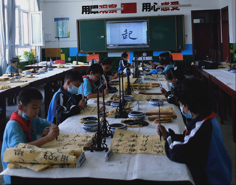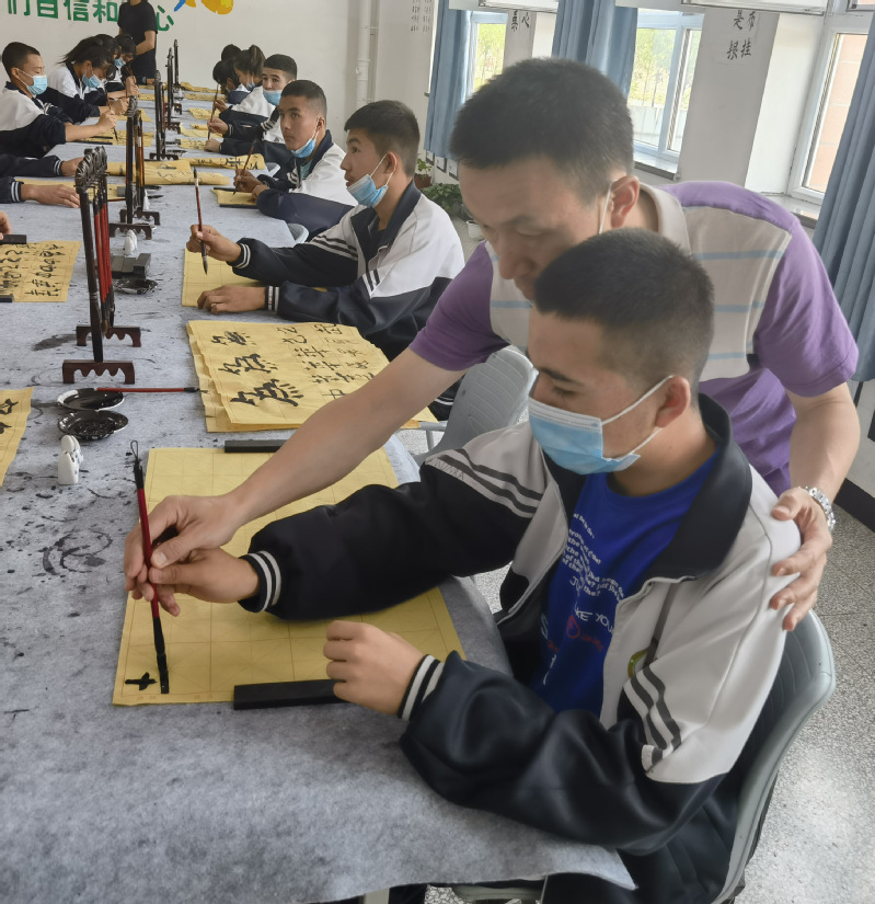 美术与设计系主任李子副教授和刘媛媛副教授带领三名学生志愿者分别在四十四团中学、五十一团中学开展了为期两天的弘扬中华传统文化——书法浸润、民族文化——模戳印花社团活动。在教学活动中,两位老师与学生志愿者手把手教孩子们写书法、从握笔姿势到每个字的结构,一一讲解。两天的课程,学生们的书写都有了很大进步。尤其是师生们一起大声颂读“为中华之崛起而读书”把整个活动拉向高潮。维吾尔族非物质文化遗产模戳印花也给孩子们带来了不一样的体验,一个个形状各异的模戳图案,通过组合、旋转、重组后变成了极具创意的作品,刘媛媛老师夸赞学生们各个都是非遗小传承人。当天天色虽已晚,可学生们仍热情不减,专注于各自的作品创作。