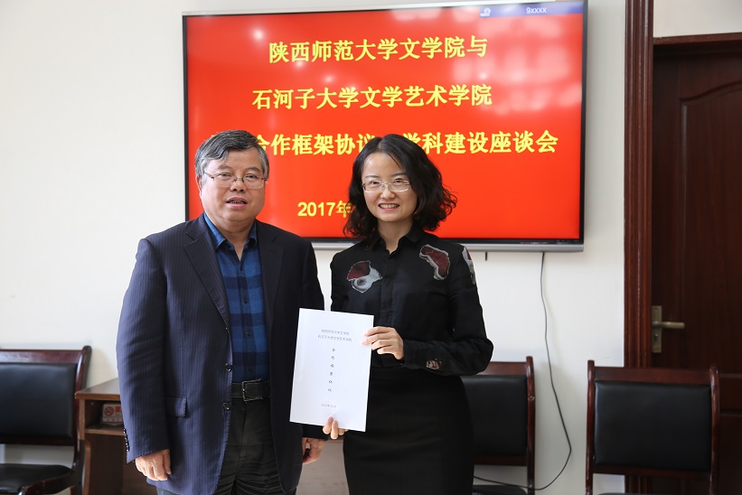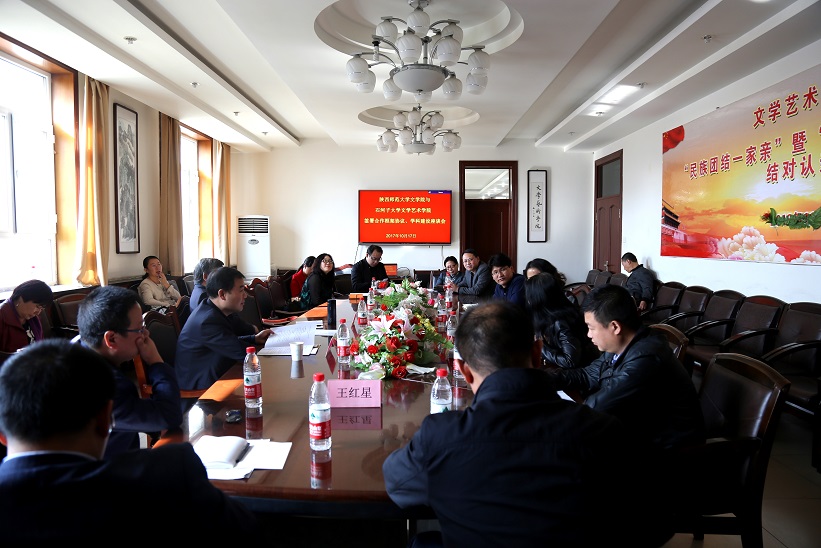 2017年10月17日,陕西师范大学文学院院长张新科、学科建设处副处长闫文杰一行访问必赢565net官网,并与必赢官网领导及各专业学科带头人就学科建设与学位点建设等问题展开座谈,双方签署了合作框架协议。石河子大学党校办副主任陈飞、必赢565net官网党委书记孙桂香、学院副院长王晓鹃以及必赢565net官网各学科带头人、硕士生导师共同参与本次座谈。