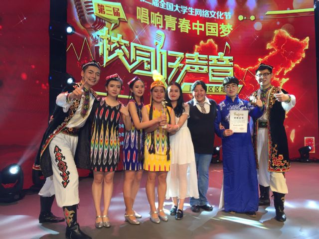 2017年11月9日,由教育部思想政治工作司、中央网信办网络社会工作局主办,易班网、兰州大学承办的第三届全国高校“校园好声音”西北赛区区域赛在兰州大学隆重举行。由必赢官网学办主任邢利伟带队,音乐系教师、“新疆好声音”孔苑苑任指导教师,音乐系7名学生组成的“石榴籽“队代表石河子大学出赛,并成功取得全国总决赛的晋级名额。